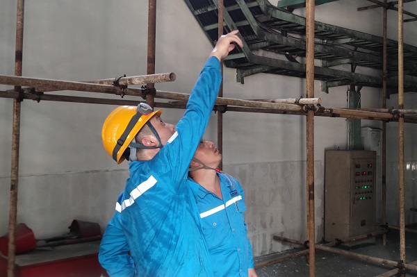 制造分廠廠長易軍和工段長周飛來到二線煤磨房現(xiàn)場(chǎng)查看設(shè)備狀況,他們的勞保服已經(jīng)被汗水浸透。(張洪俊/攝)