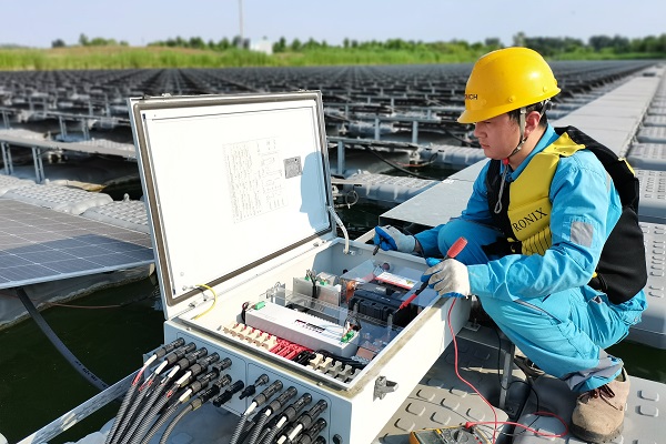 安徽宿州,海螺新能源華陽電站20區(qū)1號(hào)逆變器漂浮組件區(qū)域,運(yùn)維技術(shù)員方星正在對(duì)水面光伏匯流箱支路接地故障進(jìn)行檢查處理。(衛(wèi)任云/攝)
