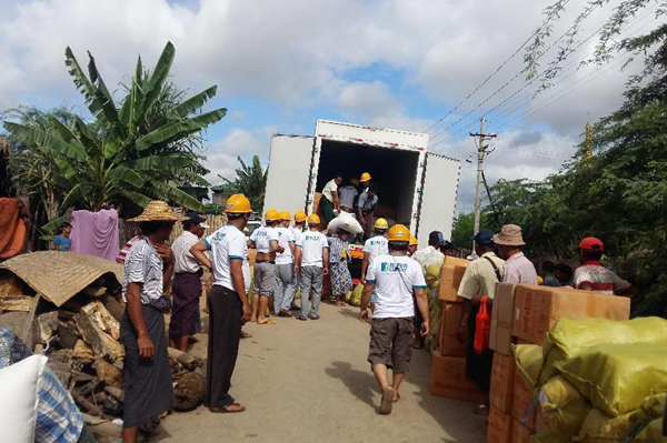 2016年8月,曼德勒地區(qū)發(fā)生水災,緬甸曼德勒海螺向受災群眾捐贈賑災物資