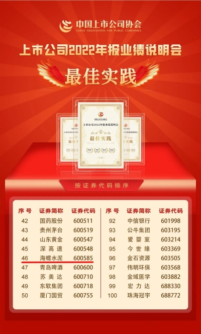 近日,中國上市公司協(xié)會發(fā)布“2022年報(bào)業(yè)績說明會最佳及優(yōu)秀實(shí)踐”評選結(jié)果,海螺水泥榮獲“上市公司2022年報(bào)業(yè)績說明會最佳實(shí)踐”獎(jiǎng)。
