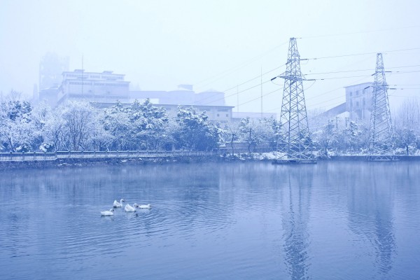 青山不老,因雪白頭。一場雪后,冬日的礦山覆上了一層冬裝,寒霧籠紗,遠(yuǎn)處隱約空蒙,近處清明沉靜,唯有行駛的礦車打破了這份寧靜。白鵝在海螺湖上游蕩,一圈圈漣漪蕩漾開來,譜寫出一曲浪漫的冬日戀歌。山水皆靜,不由得想起明朝張岱的那篇《湖心亭看雪》:“余拏一小舟,擁毳衣爐火,獨(dú)往湖心亭看雪”。朔風(fēng)寒夜,掬一捧白雪,圍爐煮茶,亦是有滋有味。