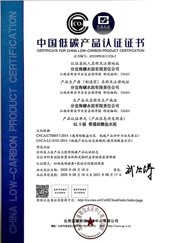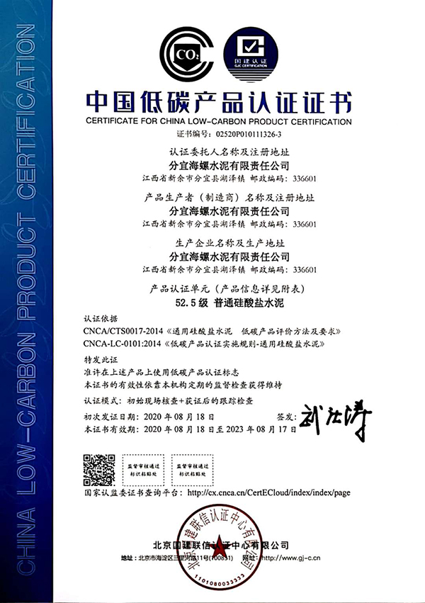 近期,分宜海螺水泥有限責(zé)任公司生產(chǎn)的水泥產(chǎn)品(包含通用水泥熟料、普通硅酸鹽水泥P.O42.5、普通硅酸鹽水泥P.O52.5)順利通過國家低碳產(chǎn)品認(rèn)證審核,獲得《低碳產(chǎn)品認(rèn)證證書》,成為新余首家取得低碳產(chǎn)品認(rèn)證證書的企業(yè)。同時(shí)獲得《能源管理體系認(rèn)證證書》。