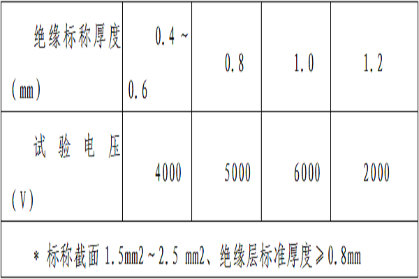 絕緣線芯應(yīng)經(jīng)受下表規(guī)定的交流50Hz電壓火花試驗(yàn)。(火花試驗(yàn)應(yīng)保證絕緣每點(diǎn)上經(jīng)受電壓的作用時(shí)間不少于0.2s)。