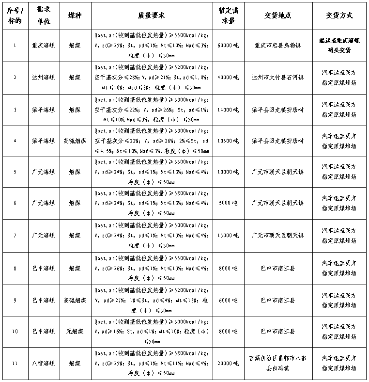 達(dá)州海螺、梁平海螺、廣元海螺、巴中海螺報(bào)價(jià)要求為一票制汽運(yùn)至買方原煤堆場(chǎng)交貨價(jià)(含13%增值稅),賣方負(fù)責(zé)到廠卸貨到買方指定地點(diǎn);