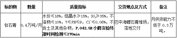 3.投標(biāo)渠道必須為直供渠道或加工型企業(yè),擁有穩(wěn)定的鈦石膏原渣來(lái)源(需提供可經(jīng)核實(shí)的相關(guān)包銷(xiāo)協(xié)議、處置協(xié)議,不接受委托書(shū))和固定的加工設(shè)備及必要的堆存場(chǎng)地。新渠道需經(jīng)招標(biāo)人實(shí)地調(diào)研取樣化驗(yàn)合格后方可參與投標(biāo),除化學(xué)指標(biāo)外,招標(biāo)人需要對(duì)新渠道鈦石膏凝結(jié)時(shí)間進(jìn)行檢測(cè),要求在PO42.5R小磨實(shí)驗(yàn)中終凝時(shí)間不高于270min。招標(biāo)人有權(quán)對(duì)投標(biāo)材料中的真實(shí)性予以進(jìn)一步核實(shí),投標(biāo)渠道須無(wú)條件予以配合。
