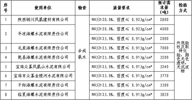 根據(jù)陜甘區(qū)域8家水泥企業(yè)生產(chǎn)經(jīng)營計(jì)劃,擬對2023年度區(qū)域8家公司工業(yè)氨水進(jìn)行公開聯(lián)合招標(biāo),為進(jìn)一步體現(xiàn)“公平、公正、公開”的原則,此次招標(biāo)在安徽海螺水泥股份有限公司海螺陽光智慧采購平臺公開進(jìn)行。現(xiàn)將招標(biāo)采購信息發(fā)布如下: