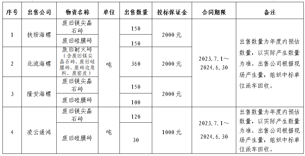 為規(guī)范區(qū)域內(nèi)各公司自動(dòng)插袋包裝機(jī)所用自動(dòng)袋外包裝紙盒(簡(jiǎn)稱:廢紙盒)、廢舊耐火磚出售管理,保證廢紙盒、廢舊耐火磚出售過(guò)程的公開(kāi)、公平、公正,擬開(kāi)展廣西區(qū)域2023-2024年度廢紙盒、廢舊耐火磚出售招標(biāo)工作,現(xiàn)將招標(biāo)信息公示如下: