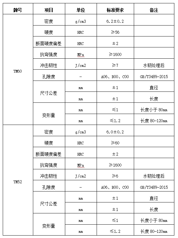 其他要求:硬質(zhì)合金材料不得有因欠燒、過燒導致的外觀、內(nèi)部缺陷;硬質(zhì)合金材料生產(chǎn)用燒結(jié)設(shè)備需要密封良好,不得有因泄漏導致的外表氧化過度;硬質(zhì)合金材料要求無磁性;硬質(zhì)合金材料燒結(jié)時需盡可能減少鎂砂等耐火材料的粘連,避免因粘連導致的尺寸超差;硬質(zhì)合金材料在澆注鋼水溫度小于1500℃時,不得出現(xiàn)變形、斷裂、漂浮問題。若出現(xiàn)以上問題,損失由供應廠家承擔。