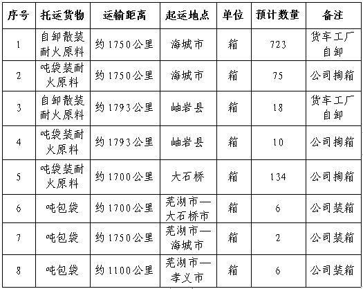1.2起止地點:原料裝運起點為遼寧省海城市/岫巖縣/大石橋市供貨單位指定裝貨倉庫—終點安徽海螺暹羅耐火材料公司倉庫;噸袋裝運為海螺耐火材料公司倉庫至大石橋市、海城市、孝義市。