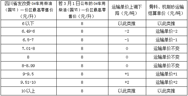 2.本次招標(biāo)運(yùn)輸費(fèi)用為運(yùn)輸?shù)綇S卸貨所發(fā)生的一切費(fèi)用。運(yùn)價(jià)在合同期內(nèi)執(zhí)行油價(jià)與運(yùn)價(jià)聯(lián)動(dòng)機(jī)制的運(yùn)輸招標(biāo):以四川省發(fā)改委2024年3月1日公布的0#車用柴油(國Ⅵ)一價(jià)區(qū)最高零售價(jià)***元/升作為油價(jià)聯(lián)動(dòng)基準(zhǔn)價(jià),如在合同期內(nèi)四川省發(fā)改委公布0#車用柴油(國Ⅵ)一價(jià)區(qū)最高零售價(jià)格(以下簡(jiǎn)稱:公布最新油價(jià))漲跌幅度超過1元/升,啟動(dòng)油價(jià)聯(lián)動(dòng),調(diào)整日期與四川省發(fā)改委公布油價(jià)調(diào)整日期同步。具體方式為:①若合同期內(nèi)公布最新油價(jià)較基準(zhǔn)價(jià)上調(diào)或下降幅度小于等于1元/L,則運(yùn)輸費(fèi)用不作調(diào)整;②若合同期內(nèi)公布最新油價(jià)較基準(zhǔn)價(jià)漲跌幅度大于1元/L,小于等于1.5元/L,則運(yùn)輸費(fèi)用在合同價(jià)基礎(chǔ)上上調(diào)或下降1元/噸;③若合同期內(nèi)公布最新油價(jià)較基準(zhǔn)價(jià)漲跌幅度大于1.5元/L,小于等于2元/L,則運(yùn)輸費(fèi)用在合同價(jià)基礎(chǔ)上上調(diào)或下降2元/噸,以次類推。