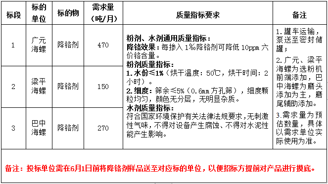 根據(jù)廣元、梁平、巴中海螺三公司生產(chǎn)經(jīng)營計劃需求,現(xiàn)對2024年7月-2025年6月期間水泥生產(chǎn)用降鉻劑進行公開招標,為體現(xiàn)公平、公正、公開、透明的原則,現(xiàn)將招標相關(guān)事宜公告如下: