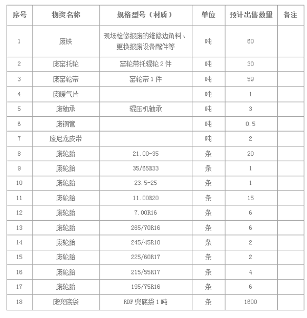 根據(jù)公司現(xiàn)場(chǎng)實(shí)際情況,本著“公開(kāi)、公平、公正、誠(chéng)實(shí)信用和競(jìng)爭(zhēng)、擇優(yōu)”原則,濟(jì)寧海螺水泥有限責(zé)任公司擬開(kāi)展廢舊物資公開(kāi)招標(biāo),歡迎具備條件的單位參加,現(xiàn)將有關(guān)事項(xiàng)公示如下:
