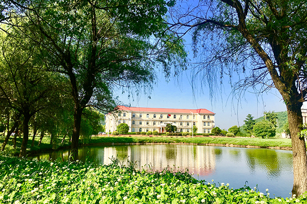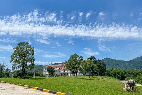 藍天白云下,蔥郁樹木錯落點綴著如茵綠草,遠處的辦公樓靜立其間,連綿青山為幕,勾勒出一幅明媚清新的自然景致。