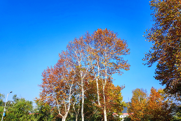 湛藍天空下,樹木枝葉浸染斑斕秋色,于工業(yè)景致中勾勒出一抹自然暈染的生機畫卷。