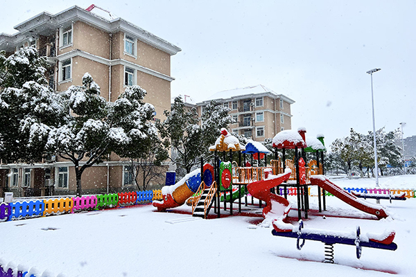 皚皚白雪包裹著童趣盎然的游樂場,與遠處淺褐色的宿舍樓剪影相映成趣。
