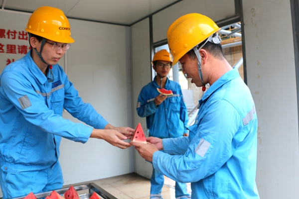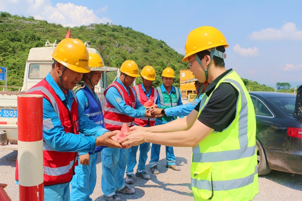 “大家辛苦了!一定要注意勞逸結(jié)合?!惫?/span>慰問組反復(fù)叮囑各班組長科學(xué)調(diào)配作業(yè)時間,礦山分廠爆破安全員熊師傅接過鹽汽水,臉上洋溢著笑容:“公司這么關(guān)心我們,這份清涼來得太及時了,我們一定加倍努力,保障生產(chǎn)安全高效!”