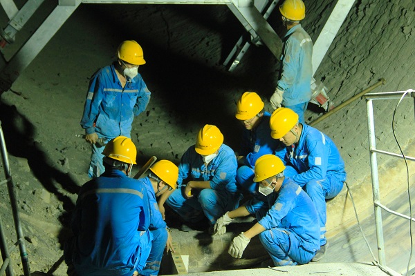 制造二分廠廠長鄭新軍正在4號(hào)窯胴體內(nèi)與施工負(fù)責(zé)人研討耐火磚砌筑方案,你一言、我一語,火熱的環(huán)境見證著海螺人火熱的激情。(王凱/攝)