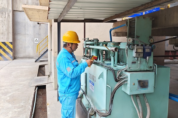 在高溫風(fēng)機(jī)油站前,制造分廠副廠長羅紅波緊盯著儀器讀數(shù),對(duì)設(shè)備運(yùn)行情況進(jìn)行逐一點(diǎn)檢?!霸O(shè)備‘中暑生病’,也同樣十分危險(xiǎn),點(diǎn)檢工作可馬虎不得?!绷_紅波說。(朱貴宏/攝)