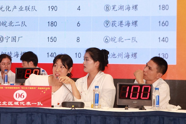 進入審時度勢環(huán)節(jié),現(xiàn)場氛圍愈加緊張而激烈,這一輪考驗著選手的綜合實力和戰(zhàn)術(shù)策略。各代表隊根據(jù)自身得分情況,自主選取40分、30分、20分三種不同分值題目作答。在這一輪,有的代表隊背水一戰(zhàn)、成功“逆襲”,有的代表隊穩(wěn)扎穩(wěn)打、保持領先。各隊得分此起彼伏、場下觀眾掌聲不斷。經(jīng)過三個環(huán)節(jié)的緊張較量,樅陽海螺代表隊、省內(nèi)多元化產(chǎn)業(yè)聯(lián)隊、寧國廠代表隊等6支代表隊突出重圍,成功進入第二階段的晉級賽。