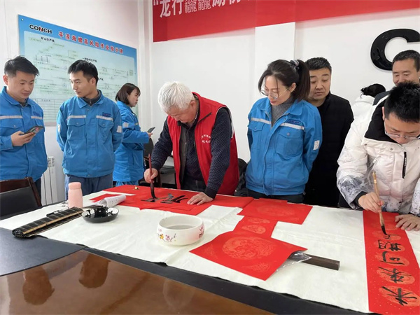 春聯(lián),表達著人們對新年迎祥納福的美好愿望。連日來,各地的書法家與海螺書法愛好者現(xiàn)場揮毫潑墨,寫春聯(lián)、送福字,壓紙、沾墨、起筆、收筆,一起一落之間,一幅幅寫滿祝福的春聯(lián)躍然紙上,將廣大員工對美好生活的向往書寫得淋漓盡致。還有的員工把對海螺的祝福寫進了對聯(lián),一起來看看吧!