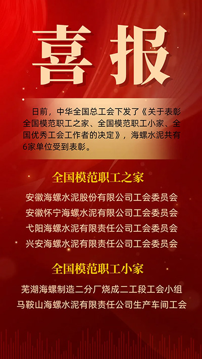 日前,中華全國(guó)總工會(huì)下發(fā)了《關(guān)于表彰全國(guó)模范職工之家、全國(guó)模范職工小家、全國(guó)優(yōu)秀工會(huì)工作者的決定》,海螺水泥共有6家單位獲得表彰。其中,安徽海螺水泥股份有限公司工會(huì)委員會(huì)、安徽懷寧海螺水泥有限公司工會(huì)委員會(huì)、弋陽(yáng)海螺水泥有限責(zé)任公司工會(huì)委員會(huì)、興安海螺水泥有限責(zé)任公司工會(huì)委員會(huì)獲評(píng)“全國(guó)模范職工之家”,蕪湖海螺水泥有限公司制造二分廠燒成二工段工會(huì)小組、馬鞍山海螺水泥有限責(zé)任公司生產(chǎn)車間工會(huì)獲評(píng)“全國(guó)模范職工小家”。