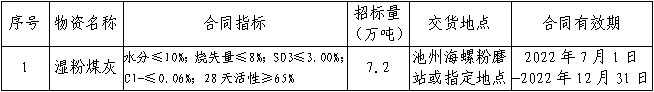 根據(jù)池州公司水泥生產(chǎn)經(jīng)營需求,安徽池州海螺水泥股份有限公司將對2022年7月1日-2022年12月31日合同期濕粉煤灰開展采購招標工作,為進一步體現(xiàn)公開、公平、公正的原則,現(xiàn)將相關(guān)事宜公告如下: