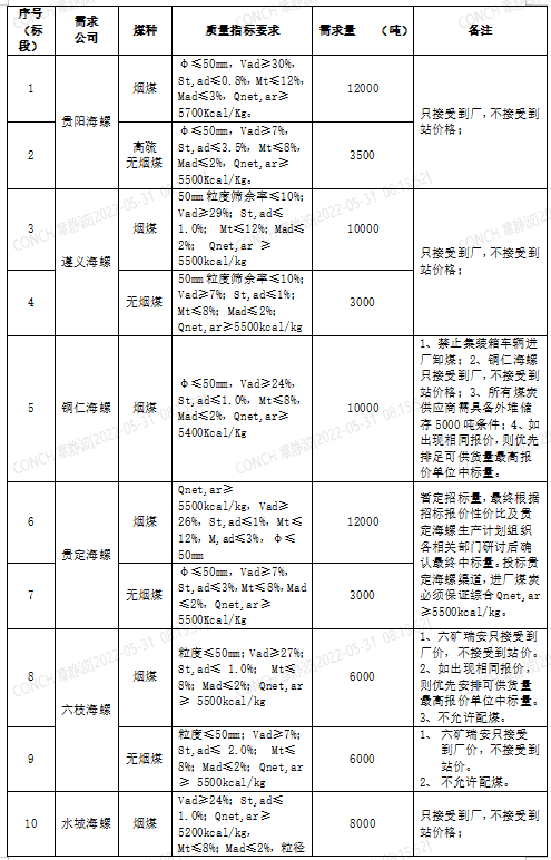 海螺水泥貴州區(qū)域擬對2022年6月21日至2022年7月20日生產(chǎn)用煤炭進行公開招標,選定中標單位,現(xiàn)將相關招標事宜公示如下: