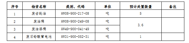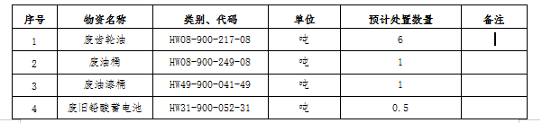 (一)標(biāo)的內(nèi)容及處置數(shù)量:廢礦物油、廢油桶、廢油漆桶、廢鉛酸蓄電池等危廢材料。處置數(shù)量以區(qū)域內(nèi)5家公司(南通海螺、海門(mén)海螺、太倉(cāng)海螺、海螺明珠、張家港海螺)實(shí)際過(guò)磅為準(zhǔn)。