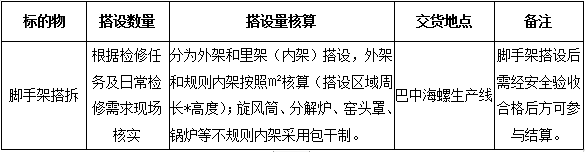 根據(jù)巴中海螺生產(chǎn)經(jīng)營(yíng)需求,為保障回轉(zhuǎn)窯、水泥磨及生產(chǎn)設(shè)備實(shí)施檢修期間的施工安全、質(zhì)量和進(jìn)度受控,部分區(qū)域需搭設(shè)腳手架。為確保腳手架搭設(shè)業(yè)務(wù)開展的合規(guī)性,本著公平、公正、公開、透明的原則,現(xiàn)將招標(biāo)相關(guān)事宜公告如下: