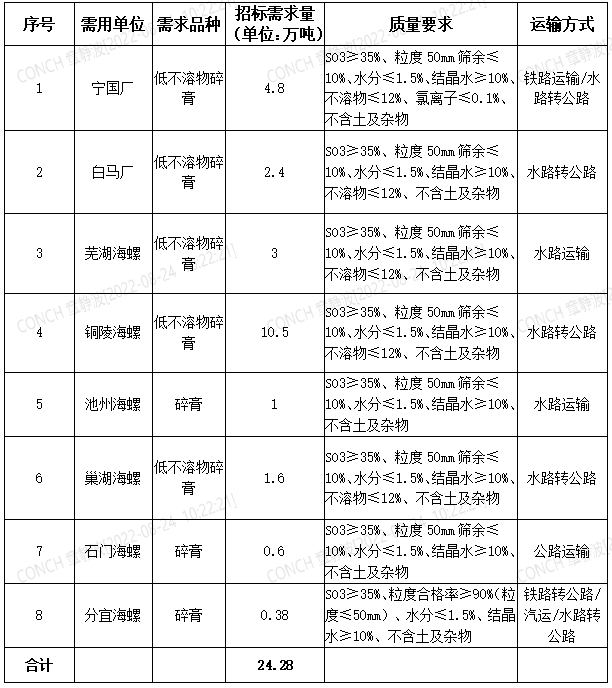 根據(jù)公司生產(chǎn)經(jīng)營(yíng)計(jì)劃,安徽海螺水泥股份有限公司對(duì)華東及中部地區(qū)2022年10月-2023年3月天然石膏進(jìn)行招標(biāo),為進(jìn)一步體現(xiàn)公平、公正、公開(kāi)的原則,拓寬采購(gòu)渠道,提高采購(gòu)質(zhì)量,現(xiàn)將招標(biāo)采購(gòu)信息發(fā)布如下: