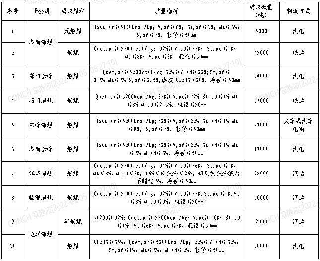 根據(jù)2022年9月21日-2022年10月20日海螺水泥湖南區(qū)域各子公司煤炭需求,現(xiàn)擬對(duì)煤炭進(jìn)行公開招標(biāo),選定中標(biāo)人,為體現(xiàn)公平、公正、公開的原則,拓寬采購渠道,現(xiàn)將招標(biāo)相關(guān)事宜公告如下: