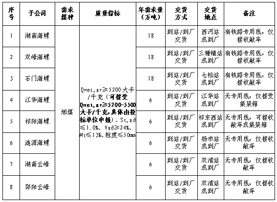 根據(jù)2023年海螺水泥湖南區(qū)域相關(guān)子公司:湖南海螺水泥有限公司(以下,簡(jiǎn)稱(chēng)“湖南海螺”)、雙峰海螺水泥有限公司(以下,簡(jiǎn)稱(chēng)“雙峰海螺”)、石門(mén)海螺水泥有限責(zé)任公司(以下,簡(jiǎn)稱(chēng)“石門(mén)海螺”)、江華海螺水泥有限責(zé)任公司(以下,簡(jiǎn)稱(chēng)“江華海螺”)、祁陽(yáng)海螺水泥有限責(zé)任公司(以下,簡(jiǎn)稱(chēng)“祁陽(yáng)海螺”)、漣源海螺水泥有限責(zé)任公司(以下,簡(jiǎn)稱(chēng)“漣源海螺”)、湖南省云峰水泥有限公司(以下,簡(jiǎn)稱(chēng)“湖南云峰”)、邵陽(yáng)市云峰新能源科技有限公司(以下,簡(jiǎn)稱(chēng)“邵陽(yáng)云峰”)8家子公司的非統(tǒng)購(gòu)直供煤炭采購(gòu)需求,擬組織湖南區(qū)域2023年非統(tǒng)購(gòu)煤炭直供渠道準(zhǔn)入網(wǎng)上公開(kāi)招標(biāo),選定中標(biāo)人。本次招標(biāo)由區(qū)域物資采購(gòu)中心牽頭,湖南海螺組織,為拓寬采購(gòu)渠道,同時(shí)體現(xiàn)公平、公正、公開(kāi)原則,現(xiàn)將招標(biāo)相關(guān)事宜公告如下: