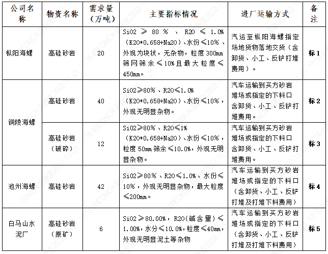 根據(jù)白馬廠、池州、銅陵和樅陽(yáng)海螺公司實(shí)際生產(chǎn)需求,本著“公開(kāi)、公平、公正”的原則,擬對(duì)直供高硅砂巖進(jìn)行公開(kāi)招標(biāo),歡迎具備條件的單位參加,現(xiàn)將招標(biāo)相關(guān)事宜公告如下: