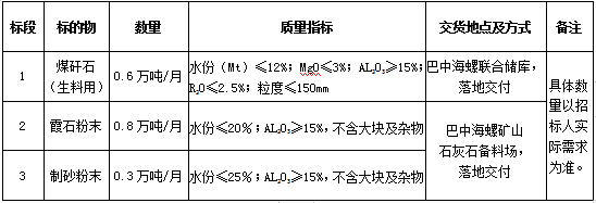 1.標的內(nèi)容:煤矸石(生料工序用)、霞石粉末、制砂粉末。
