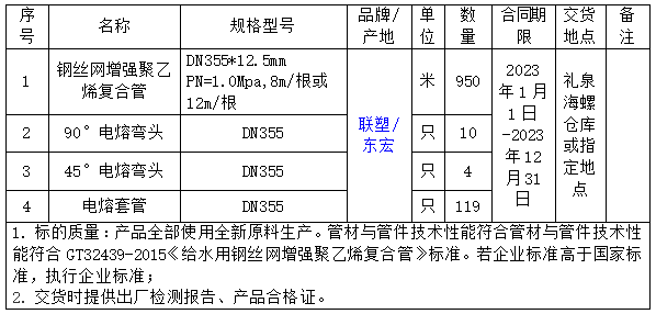 為進(jìn)一步優(yōu)化拓展供應(yīng)渠道,降低采購成本,規(guī)范采購行為,提高采購效率,本著公開、公平、公正、透明的原則,擬開展鋼絲網(wǎng)增強(qiáng)聚乙烯復(fù)合管及配件招標(biāo)采購工作,擇優(yōu)選擇供應(yīng)商,現(xiàn)將招標(biāo)基本信息發(fā)布如下: