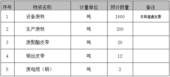 備注:(1)因設(shè)備廢鐵為我公司綜合技改拆卸設(shè)備,中標(biāo)人需安排運(yùn)輸車輛現(xiàn)場(chǎng)配合及時(shí)倒運(yùn),技改現(xiàn)場(chǎng)無(wú)場(chǎng)地進(jìn)行存放。(2)中標(biāo)人需自備切割工具、吊車、鏟車、液力設(shè)備、運(yùn)輸車輛、裝車設(shè)備等,清理場(chǎng)地垃圾等費(fèi)用包含在投標(biāo)報(bào)價(jià)內(nèi)。