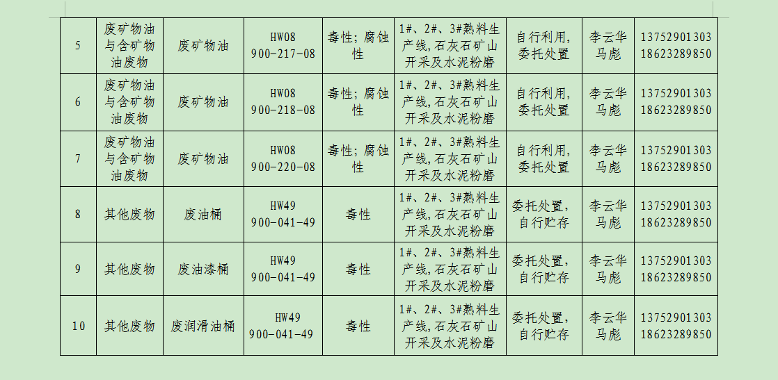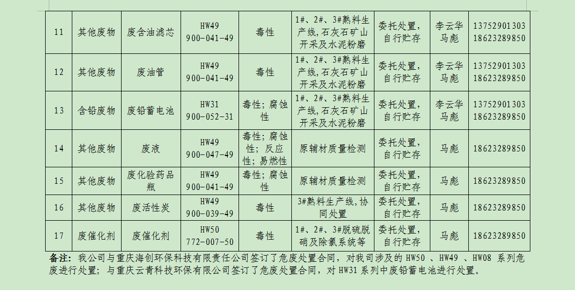 廢棄物的產(chǎn)生單位及管理:礦山分廠由俸云龍負(fù)責(zé)管理,負(fù)責(zé)督促員工把產(chǎn)生的危廢分類定期送危廢庫暫存,危廢庫由維修工段工段長(zhǎng)負(fù)責(zé),負(fù)責(zé)收集并記錄危廢臺(tái)賬;主廠區(qū)由易軍負(fù)責(zé)管理,負(fù)責(zé)督促員工把產(chǎn)生的廢分類定期送危廢庫暫存,危廢庫由環(huán)保主管馬彪負(fù)責(zé),負(fù)責(zé)收集并記錄危廢臺(tái)賬。危廢庫危廢定期聯(lián)系重慶海創(chuàng)環(huán)??萍加邢挢?zé)任公司、重慶云青環(huán)??萍加邢薰?/span>等有資質(zhì)公司回收處理并完善相應(yīng)危廢聯(lián)單。