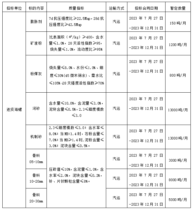 6、投標保證金繳納:已下載標書的投標單位應(yīng)在2023年7月25日10:00分標段繳納投標保證金,其中膨脹劑標段投標保證金1萬元,粉煤灰標段投標保證金1萬元,礦渣粉標段投標保證金4萬元,河砂標段投標保證金13萬元,機制砂標段投標保證金10萬元,骨料標段投標保證金13萬元(未取得供應(yīng)權(quán)單位待招標工作結(jié)束后5個工作日將及時無息退還)。