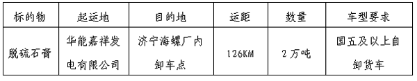 2.標(biāo)段運輸起止:華能嘉祥發(fā)電有限公司-濟(jì)寧海螺廠內(nèi)脫硫石膏卸車點。