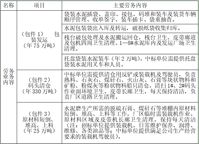 3.2、本次招標(biāo)活動(dòng)要求投標(biāo)單位具有一定水泥勞務(wù)裝卸保供經(jīng)驗(yàn)和作業(yè)能力。