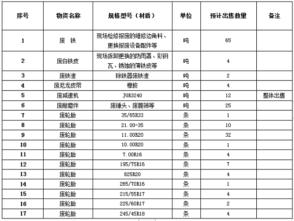 根據(jù)公司現(xiàn)場(chǎng)實(shí)際情況,本著“公開、公平、公正、誠(chéng)實(shí)信用和競(jìng)爭(zhēng)、擇優(yōu)”原則,濟(jì)寧海螺水泥有限責(zé)任公司擬開展廢舊物資公開招標(biāo),歡迎具備條件的單位參加,現(xiàn)將有關(guān)事項(xiàng)公示如下: