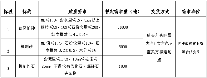 為進一步提升鐵尾礦砂及外購砂石招標的公平、公正、公開透明性,根據(jù)巴中海螺建材(商混)生產(chǎn)需求情況,現(xiàn)組織開展公開招標,特將招標事宜公告如下: