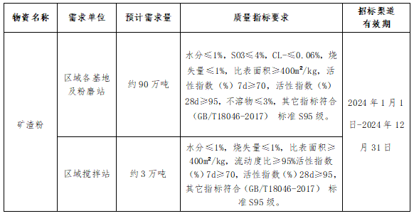 2.招標(biāo)方式:采取公開招標(biāo)方式,按礦渣粉質(zhì)量指標(biāo)要求確定區(qū)域礦渣粉中標(biāo)的供貨入圍渠道。