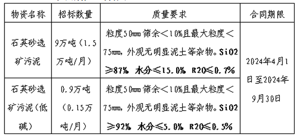 投標(biāo)人在報價時應(yīng)綜合考慮石英砂選礦污泥生產(chǎn)、運輸過程中一切不確定因素,以及我公司要求的硅含量、堿含量等質(zhì)量指標(biāo),合理報價。合同期內(nèi)價格固定不變。兩種質(zhì)量石英砂選礦污泥分標(biāo)段分別評標(biāo),按各標(biāo)段最低價原則選擇中標(biāo)單位。