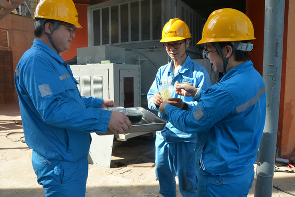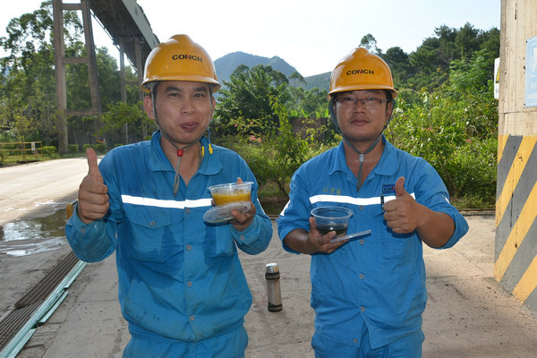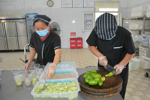 采摘下來(lái)的新鮮龍眼和檸檬很快被送往食堂,食堂師傅們忙碌起來(lái),將飽滿(mǎn)多汁的龍眼剝殼取肉,檸檬切片榨汁,熬制當(dāng)?shù)靥禺a(chǎn)涼粉草。龍眼果肉與檸檬片在清冽礦泉水中舒展,釋放出清甜與微酸的完美協(xié)奏;涼粉草熬制的“北流涼粉”,凝凍如墨玉,清涼解暑。天然原料經(jīng)巧手化作兩大消暑佳品——晶瑩剔透的龍眼檸檬水與地道爽滑的“北流涼粉”。冰鎮(zhèn)后的飲品帶著果香與涼意,被后勤人員分裝成杯,及時(shí)送到各崗位。